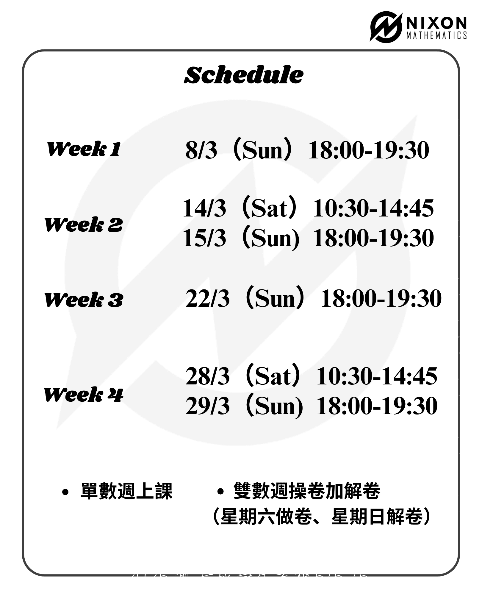 1. 因 運動/音樂/表演藝術 之 比賽/訓練/採排 與 Nixon課程/訓練 時間重疊 而未能出席,只要在 10天內 追回 課程錄影 及 完成功課,不計缺席。