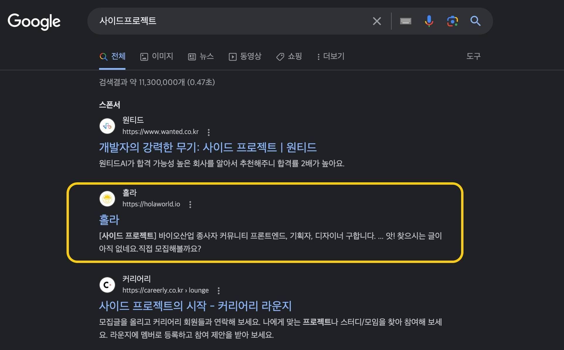 '사이드프로젝트' 키워드 검색 시 가장 먼저 노출되는 플랫폼, Hola!