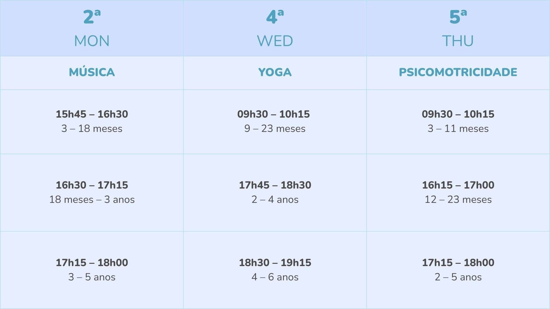 – Sessões semanais de Música, Yoga e Psicomotricidade (0-5 anos) em grupo e em família.