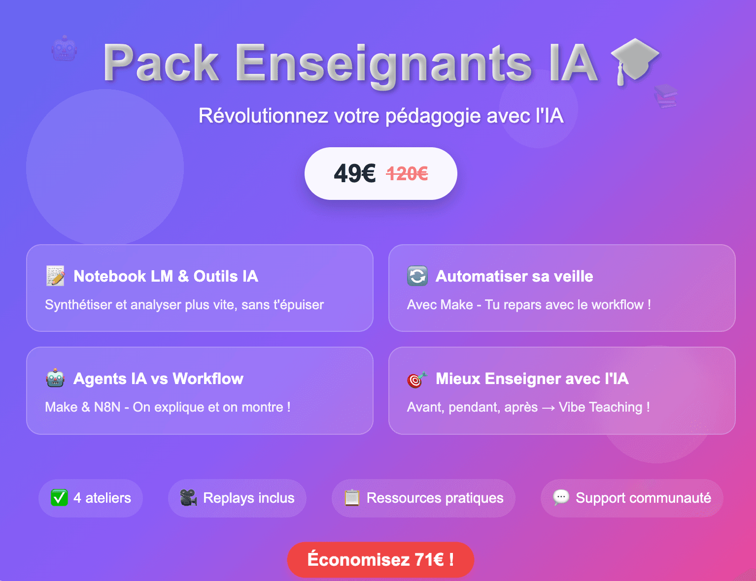 La pack offre un accès privilégié aux ateliers les plus appréciés : replays, ressources pratiques, résumés, prompts ou scénarios d'automatisation, et feuille de route pour passer à l’action. Pour 49 Euros ! Une économie de 71 euros !