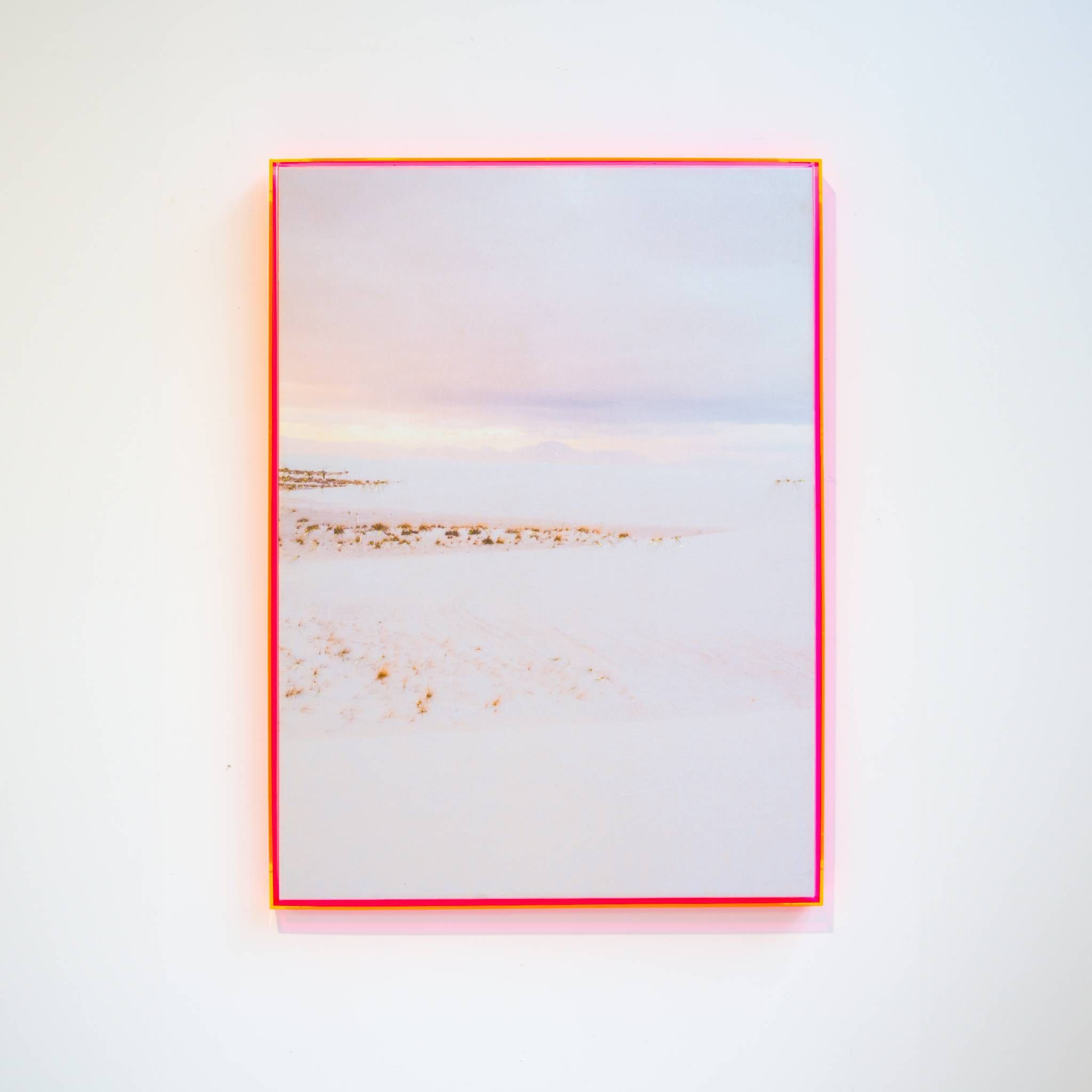 "Everything is Alright Forever" is one-of-a-kind work featuring photography on velvet, hand-embroidery with shimmering holographic thread, and framed in artist-designed fluorescent acrylic.