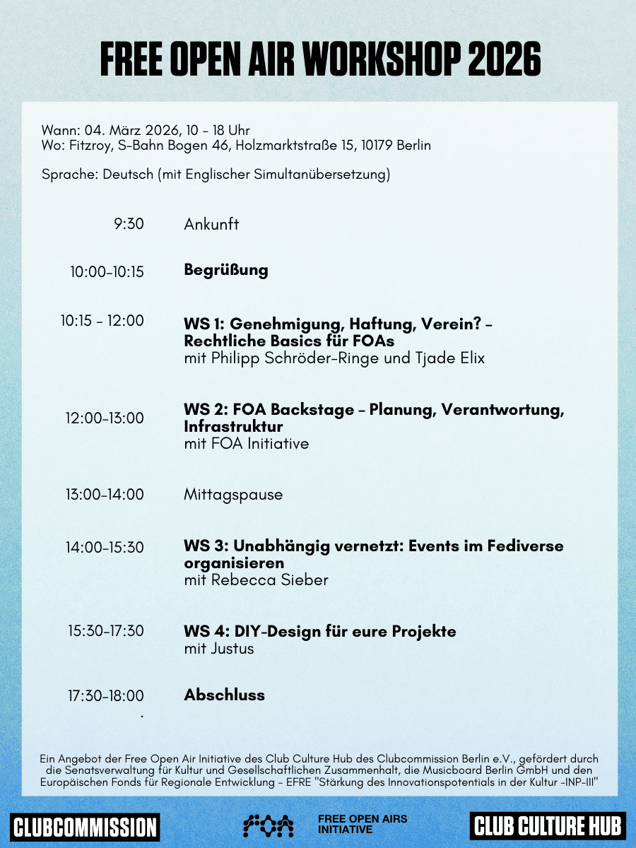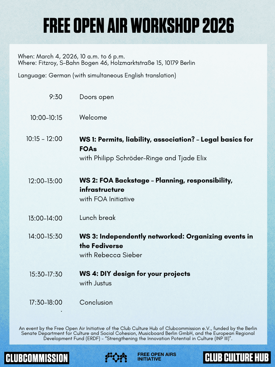 The workshop will address key topics related to the organization of free open-air events. These include the legal framework for open-air events, knowledge transfer between organizers, and the establishment of an infrastructure exchange. Other focal points include internal and external communication, the development of design for events, and networking and exchange with other collectives.