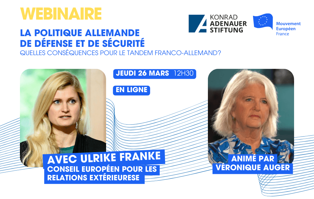 Alors que le moteur franco-allemand a rarement été aussi mis à l'épreuve face aux défis européens, le Mouvement Européen - France et la Konrad Adenauer Stiftung ont le plaisir de vous inviter à un nouveau webinaire dans le cadre d'une série consacrée à la situation politique, économique et géopolitique actuelle en Allemagne.