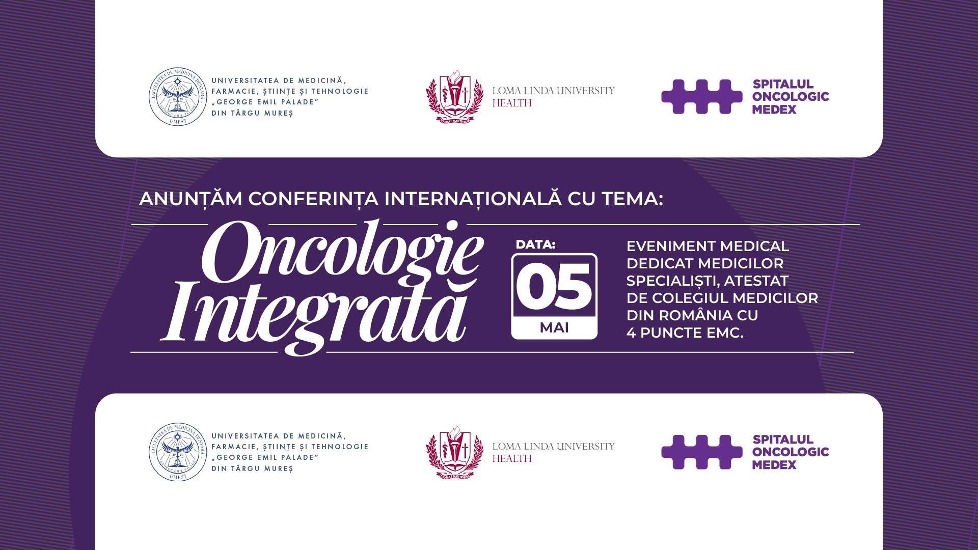 SPITALUL ONCOLOGIC MEDEX, în parteneriat cu UMFST George Emil Palade Târgu Mureș și Loma Linda University Health, organizează conferința internațională ONCOLOGIE INTEGRATĂ, dedicată medicilor specialiști implicați în diagnosticul, tratamentul și managementul multidisciplinar al pacientului oncologic.