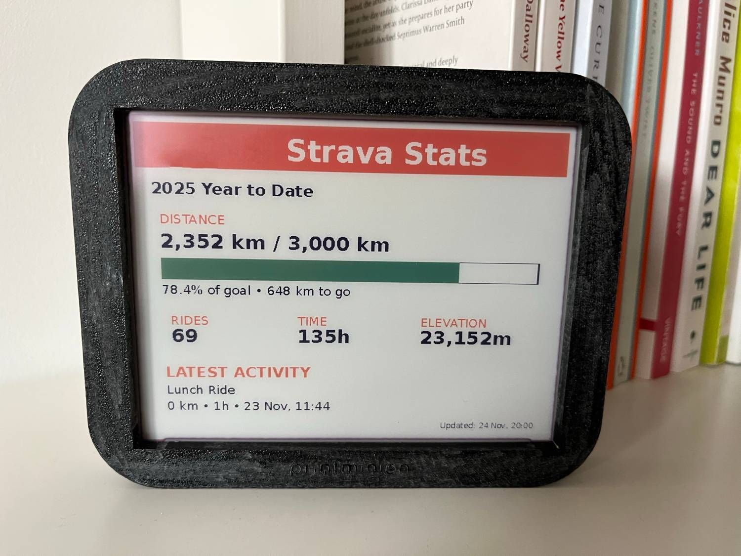 It updates twice a day, fetches your progress automatically, and uses zero power between refreshes. No charging every night. No bright screen on your wall. Just your cycling achievements, displayed like art on your wall!