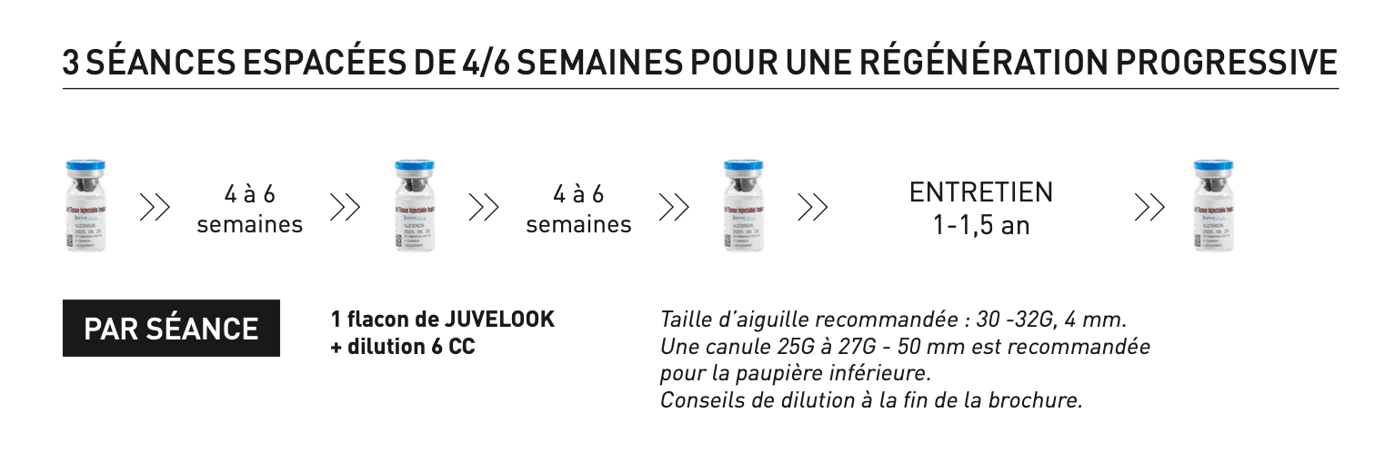 Le traitement se déroule typiquement en 3 séances, espacées de 4 à 6 semaines. Cette séquence permet une stimulation progressive et l'installation de résultats pérennes.