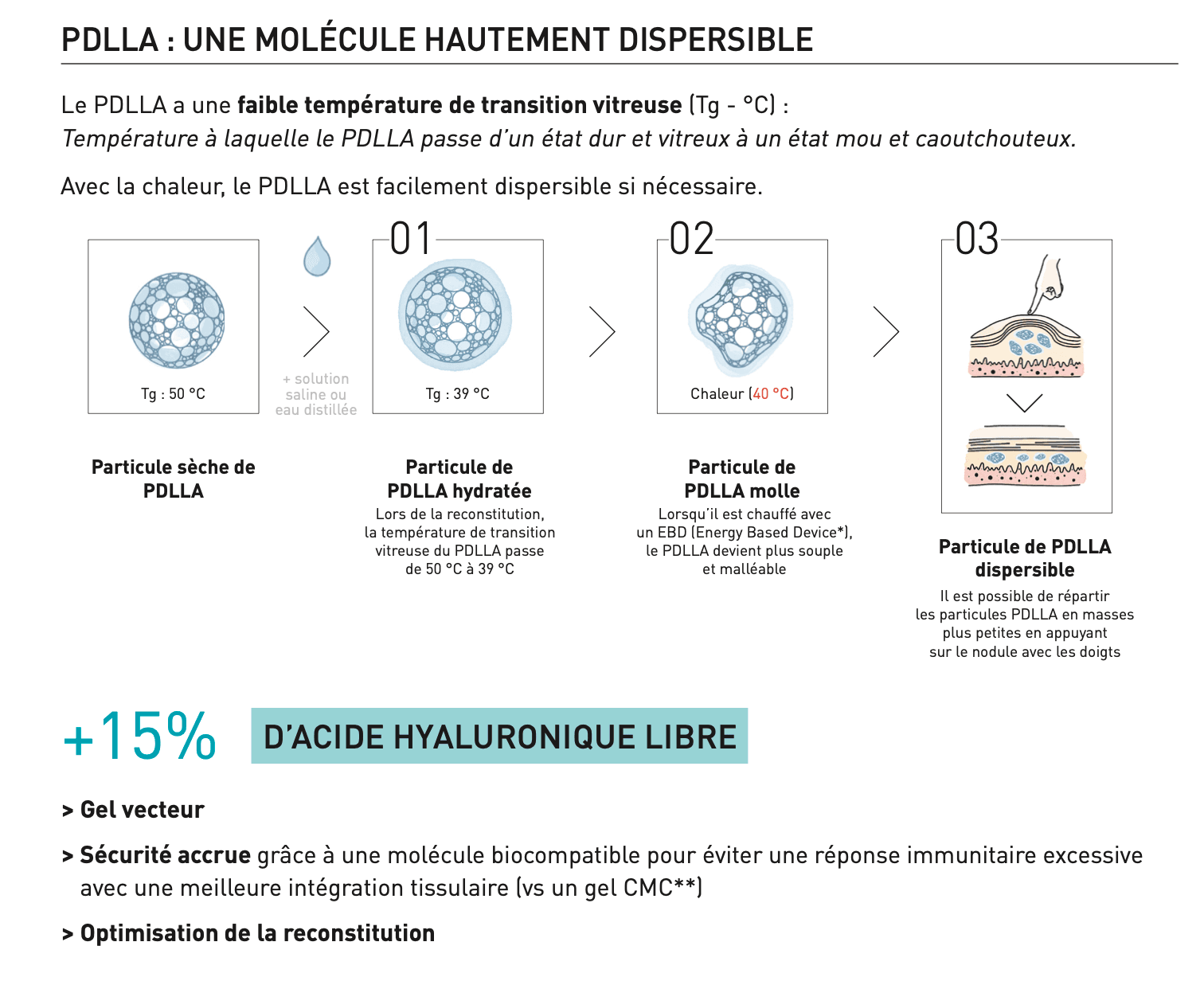 - Phase 2 - ACTION ANTI-ÂGE (Protection) : En plus de stimuler la production, le PDLLA a démontré une action protectrice sur le collagène existant en réduisant les facteurs inflammatoires qui accélèrent sa dégradation.