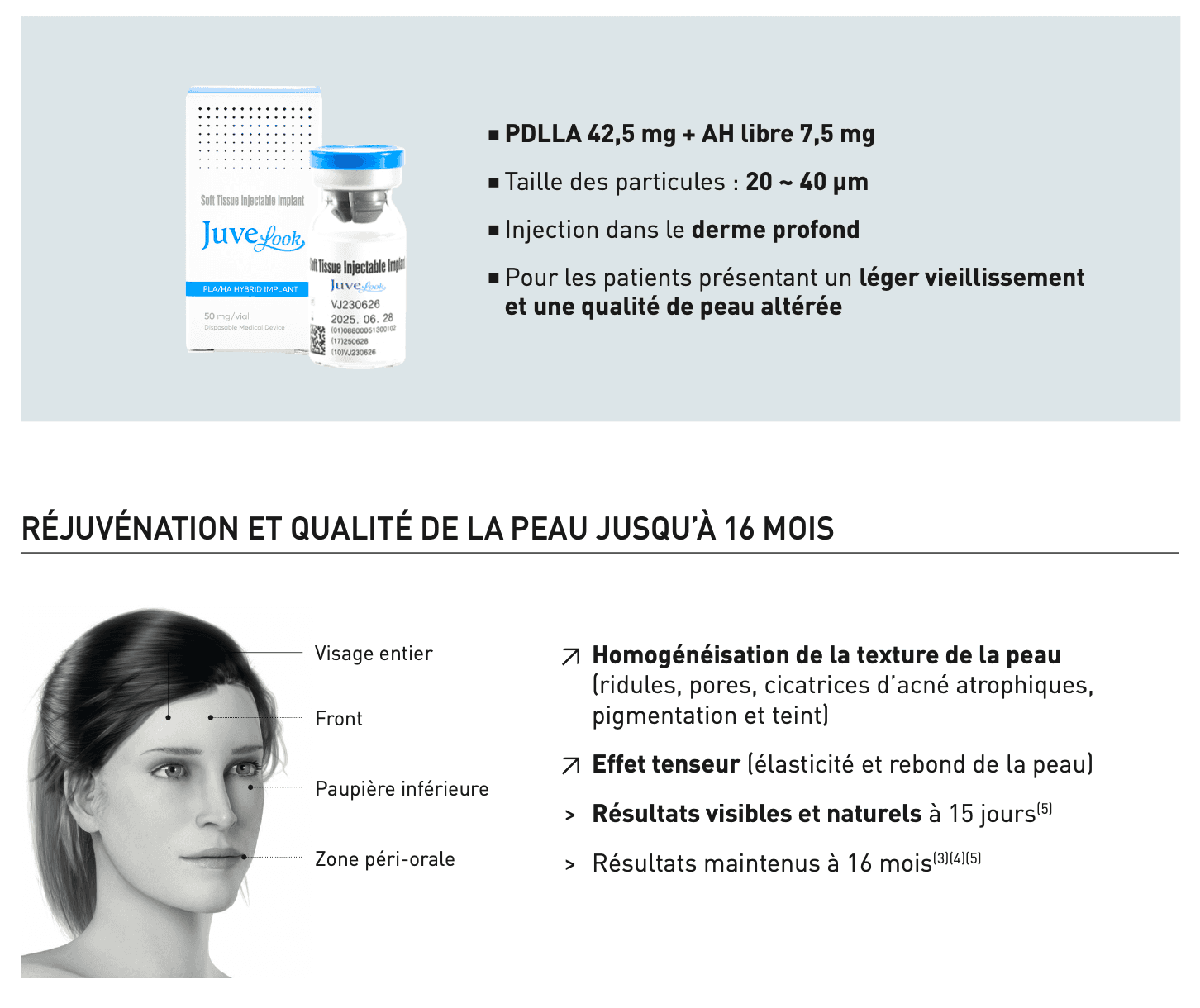 - L'Acide Poly-D,L-Lactique (PDLLA) : Des microparticules intelligentes et biodégradables qui agissent comme un signal pour vos propres cellules (les fibroblastes), leur ordonnant de relancer massivement la production d'un nouveau collagène et de nouvelles fibres d'élastine.