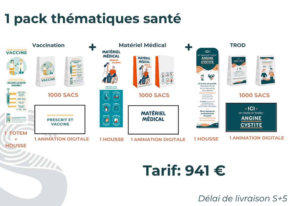 1 pack au prix de 941 € : 3 thématiques santé (vaccination, matériel médical, angine/cystite), comprenant : 1 structure totem 450X1800 mm, 3 housses, 3 000 sacs et 3 animations digitales.