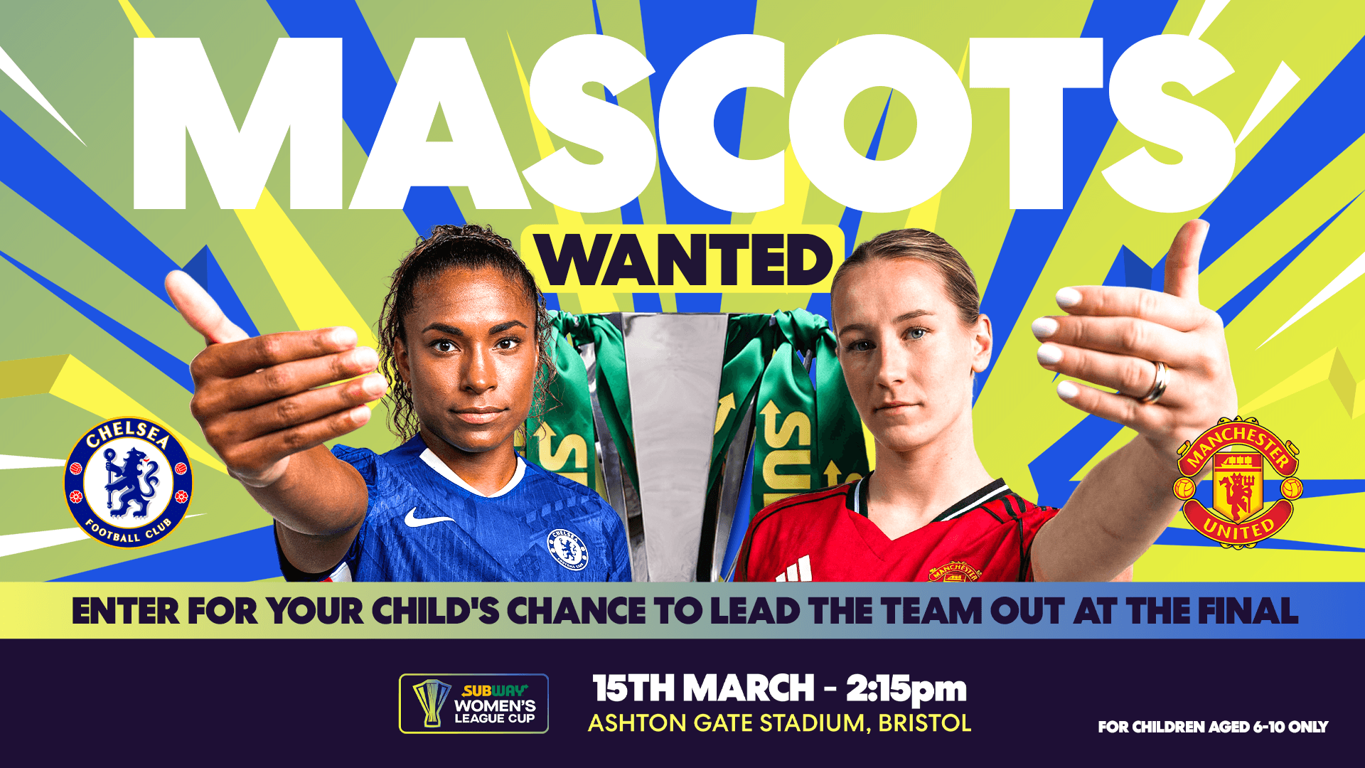 Enter for the chance to give a child you know an unforgettable moment at the Subway® Women's League Cup Final on Sunday 15 March. The winning entry will see them step onto the pitch as a matchday mascot, leading the teams out ahead of the final and experiencing the atmosphere of one of the biggest occasions in the women’s football calendar.