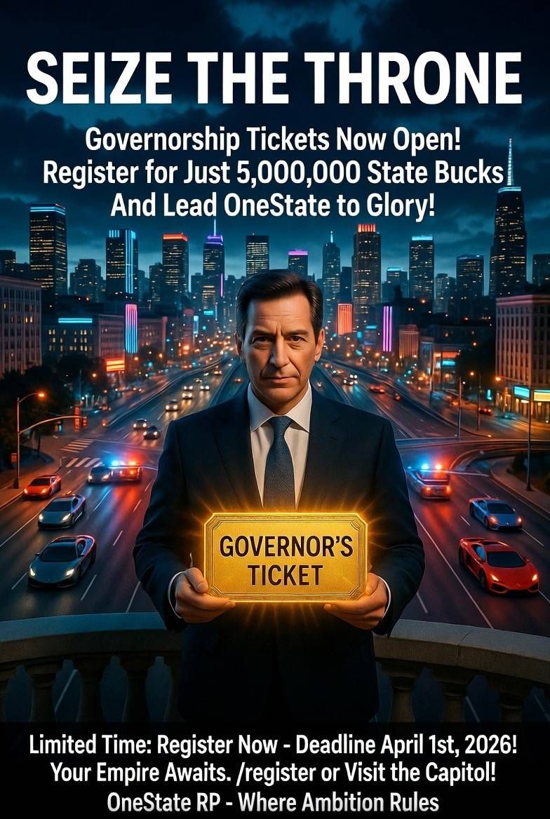 Complete this form to register as a candidate for the OneState RP Governorship candidate which kicks off by first week of April 2026. Ticket fee: 5 million State Bucks. All fields required unless noted in game."