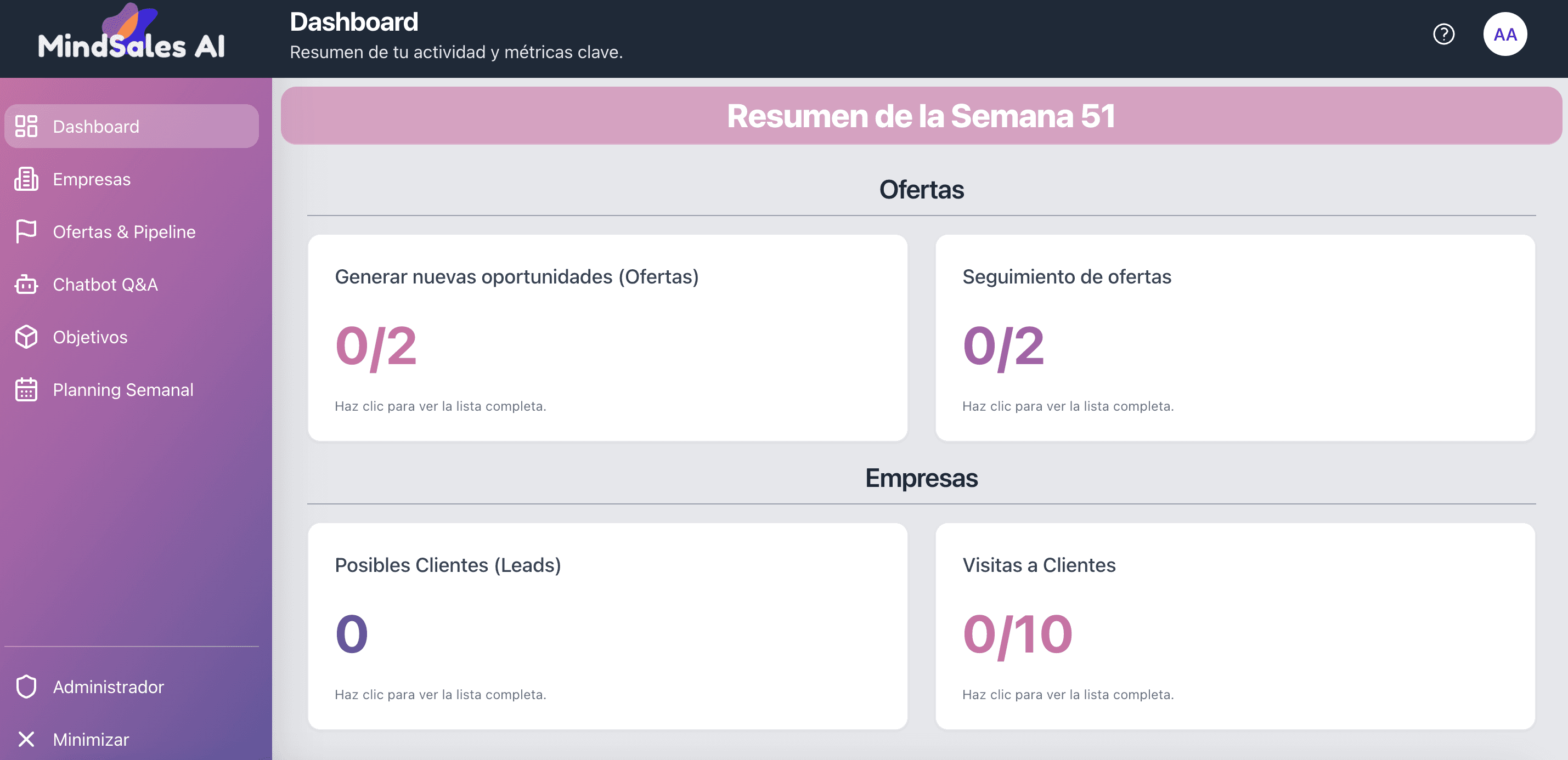 *Vista del módulo inicial de MindSales AI, destacando el Dashboard con métricas que reflejan la actividad y el progreso semanal del comercial.