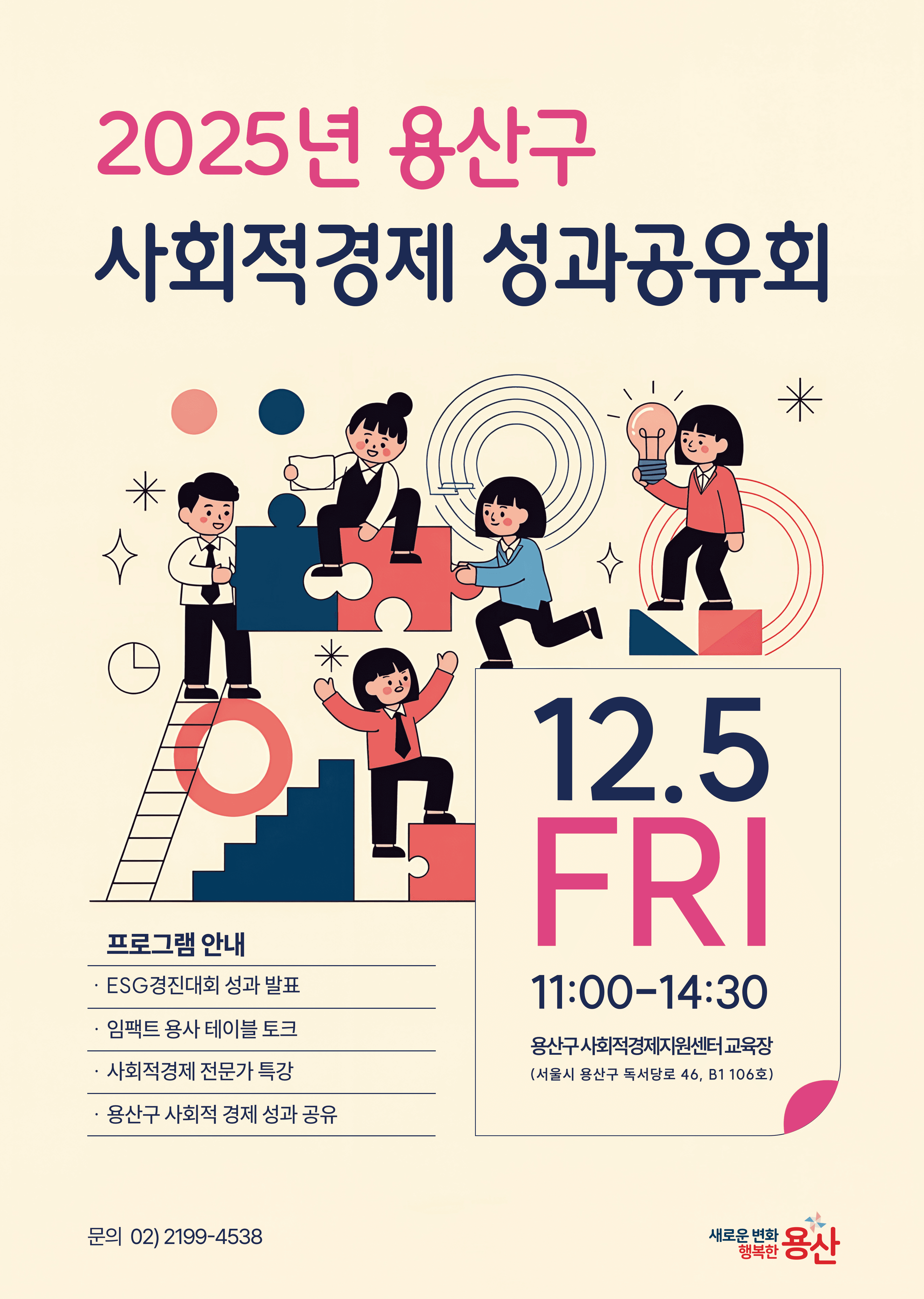 용산구청과 용산구 사회적경제지원센터는 지역 내 사회적경제기업의 상호 협력과 지속가능한 성장을 위해 「2025 용산구 사회적경제 성과공유회」를 개최합니다.