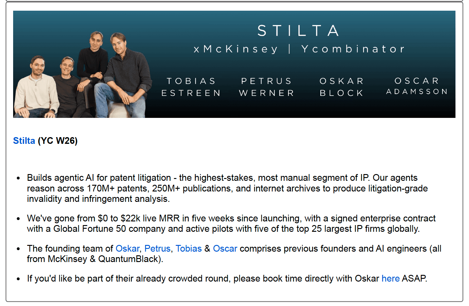 Pipeline or conversion signals - e.g. "~$700K ARR at conversion"For each founder, include: