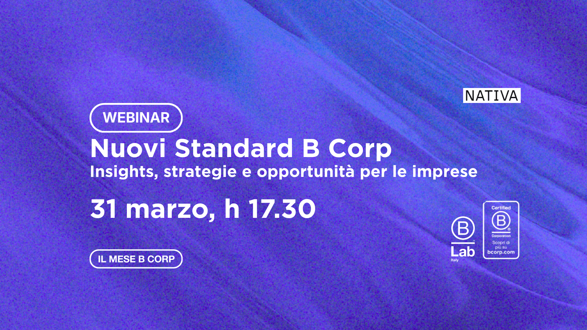 Nel 2025, i nuovi standard B Corp hanno cambiato le carte in tavola, introducendo per le aziende requisiti ambiziosi in sette aree chiave di impatto sociale, ambientale e di governance. In questo webinar organizzato da NATIVA - prima B Corp italiana e advisor di oltre 140 aziende certificate - con l'intervento di B Lab Italia, esploreremo come i nuovi standard rappresentino un'opportunità concreta di evoluzione per le imprese, poichè:
