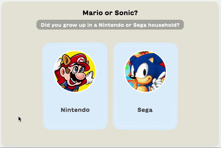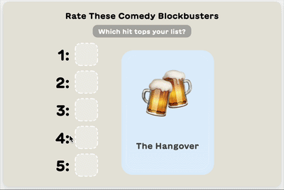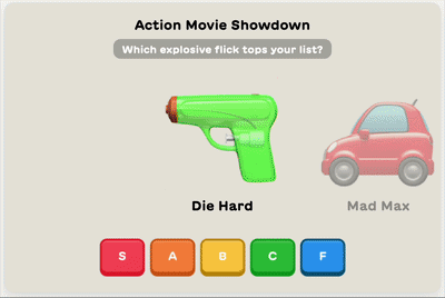 Mini Snacks are our new quick-play quiz and game formats, like swipeable personality quizzes, tier list builders, Perfect Split, and more, all embedded right on the Lil Snack homepage alongside our classic games. Please take this quick survey to tell us what you think of Mini Snacks and help us make them even better.