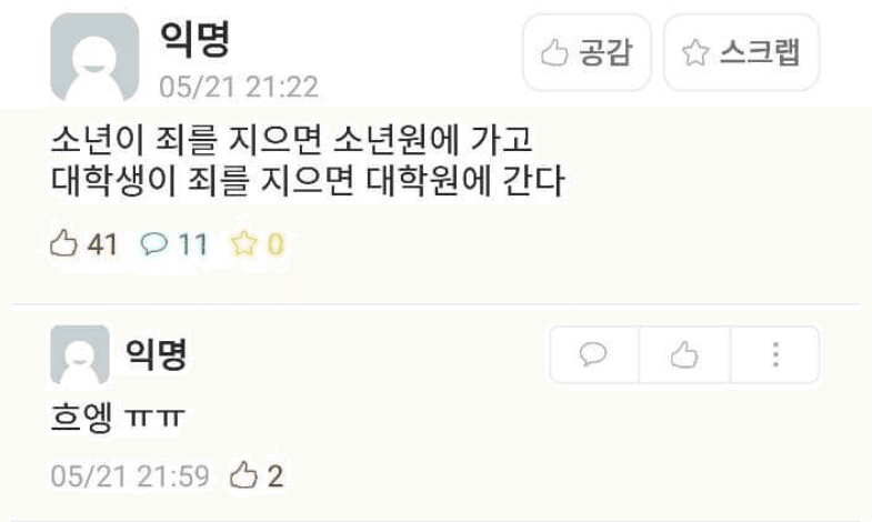 소년이 죄를 지으면 소년원에 가고 대학생이 죄를 지으면 대학원에 간다