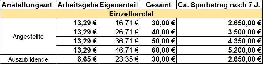 Je nach Branche stehen Ihnen vermögenswirksame Leistungen in unterschiedlicher Höhe zu. Die nachfolgenden Angaben sind Mindestwerte und können abhängig vom Arbeitgeber und der individuellen Situation des Antragstellers höher ausfallen. Die Höhe der vermögenswirksamen Leistungen durch den Arbeitgeber richtet sich nach der monatlichen Arbeitszeit. Der tatsächliche Arbeitgeberanteil wird individuell berechnet. Die tatsächliche Höhe der vermögenswirksamen Leistungen durch den Arbeitgeber kann variieren. Der Eigenanteil wird entsprechend angepasst. Das nachfolgende Beispiel stellt keine verbindliche Zusage dar.