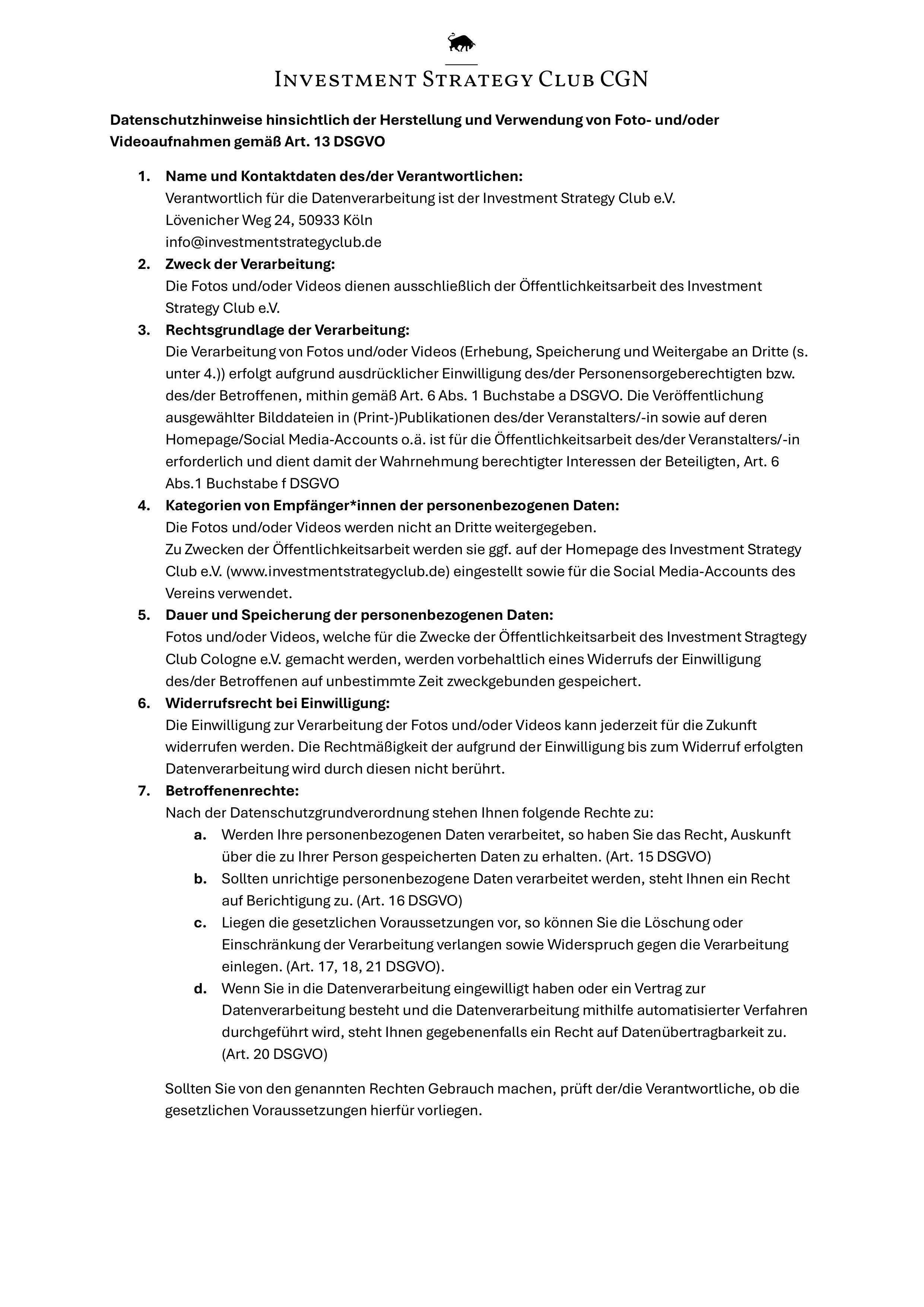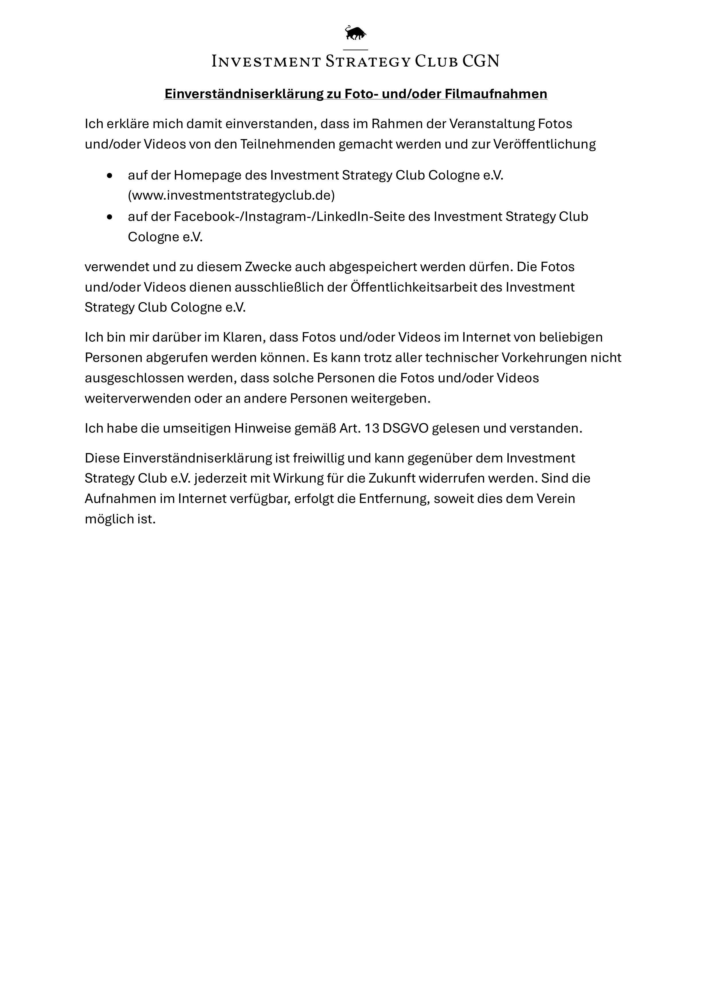 Während der Veranstaltung werden Mitglieder des Investment Strategy Club Cologne e.V. Foto- und/oder Video aufnahmen machen, die zu den unten genannten Zwecken verwendet werden.