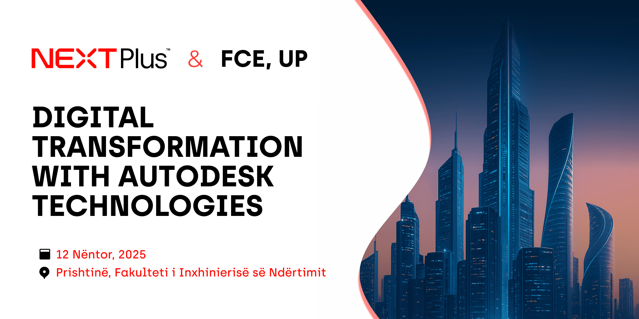 Bashkohuni me ne më 12 nëntor 2025, në ora 09:30, në Fakultetin e Inxhinierisë së Ndërtimit në Prishtinë, për eventin Digital Transformation with Autodesk Technologies : një ngjarje e dedikuar transformimit digjital në arkitekturë, inxhinieri dhe ndërtim.