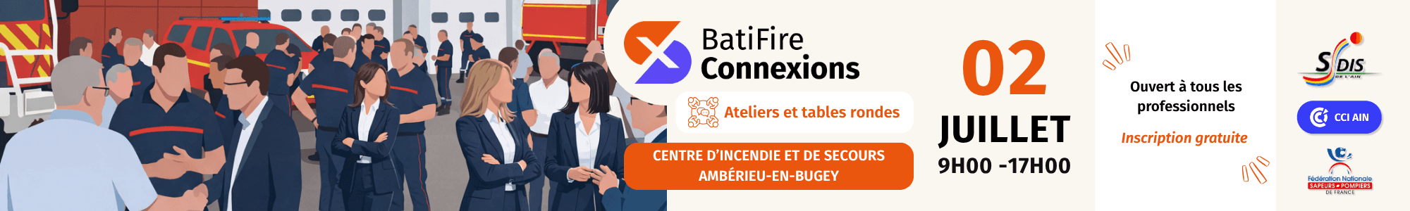 BatiFire Connexions revient le 02 juillet 2026 au Centre d’Incendie et de Secours d’Ambérieu-en-Bugey, de 9h00 à 17h00.