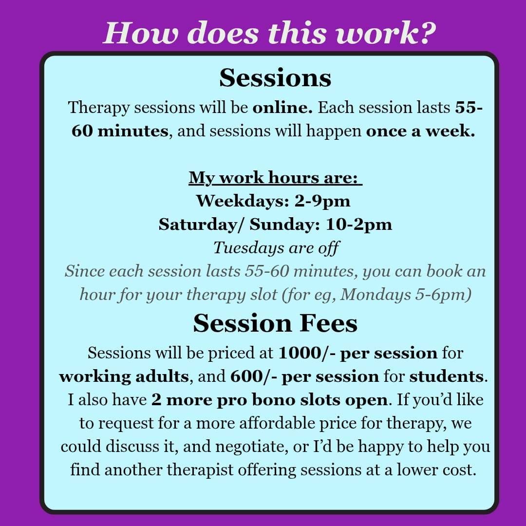 Therapy is a novel and unique experience, and it's okay to feel confused, lost or scared. If you have any questions about it, please feel free to drop them on here.