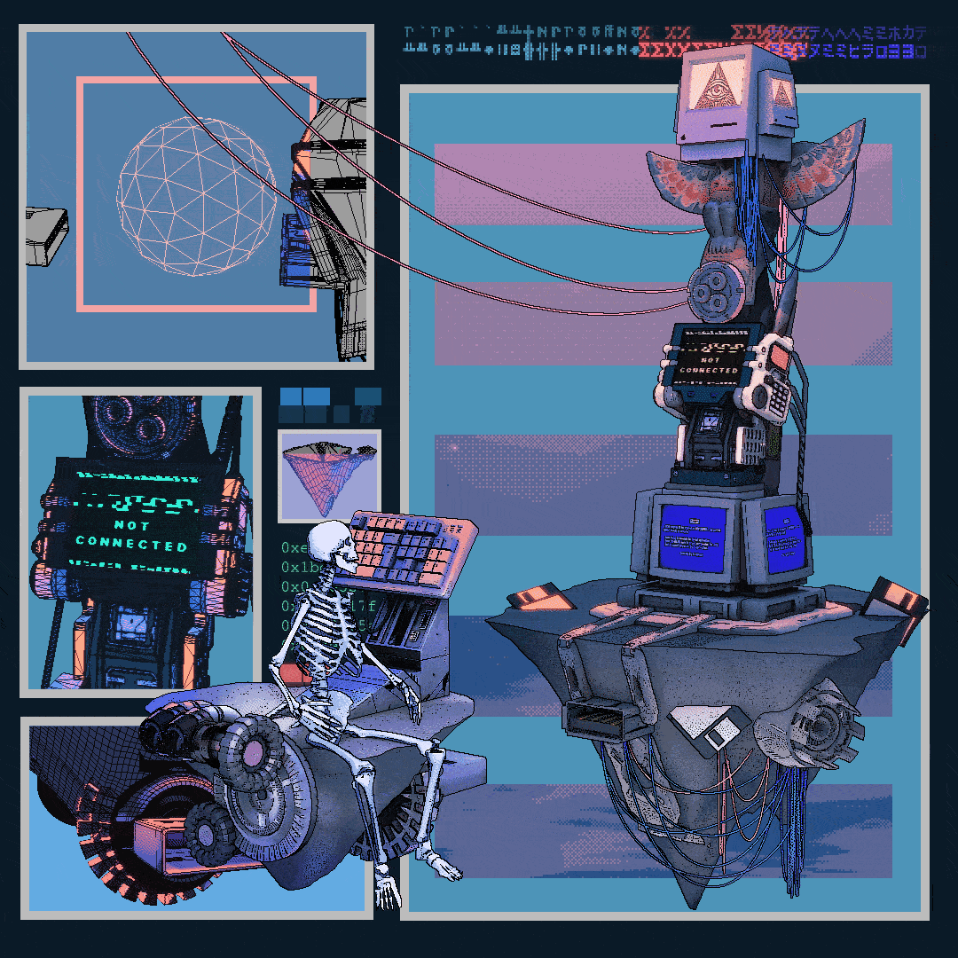 he is mostly inspired by the concept of time, science fiction, dualism, nihilism, relativity, human nature, death, vintage techs and video games. he's trying to capture the essence of our deepest fears, desires and curiosities and he thinks that even one tiniest pixel should serve a purpose to do that.