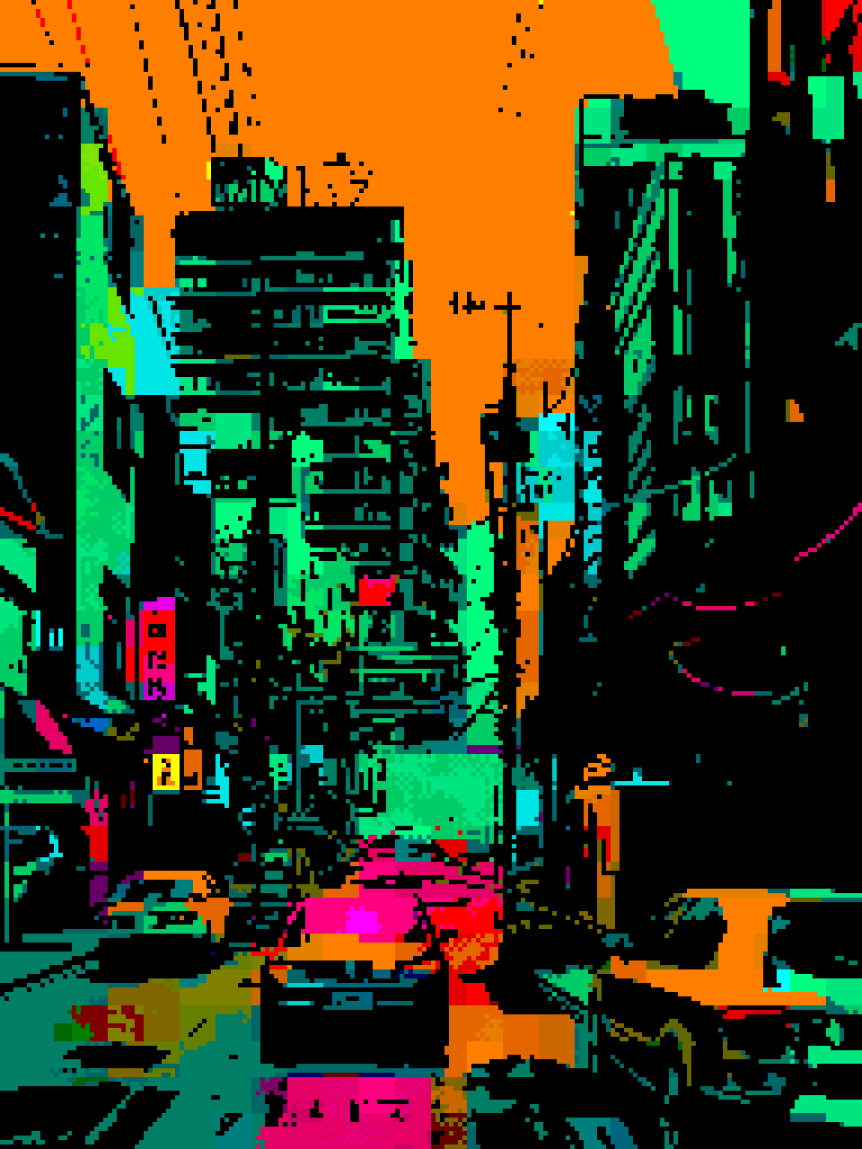 "GRID STATE ERRANT BLOCK" is an animated GIF that shows a city street scene being broken down by digital errors. As a work of Compressionism, it uses glitch effects and manipulated artifacts to turn a normal city grid into a vision of chaotic data, questioning how stable our digital world is.