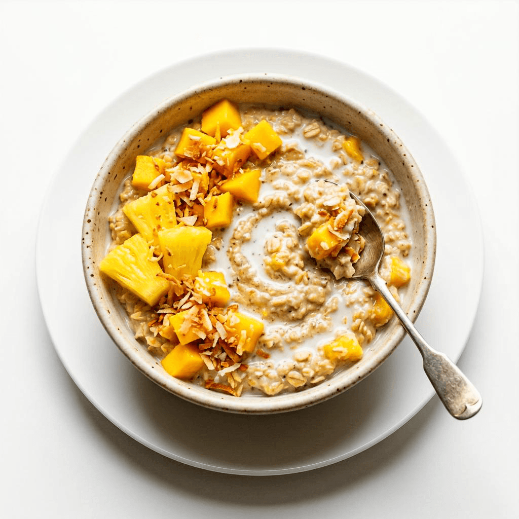 Tropical oats with coconut milk, mango, pineapple & toasted coconut - $14)