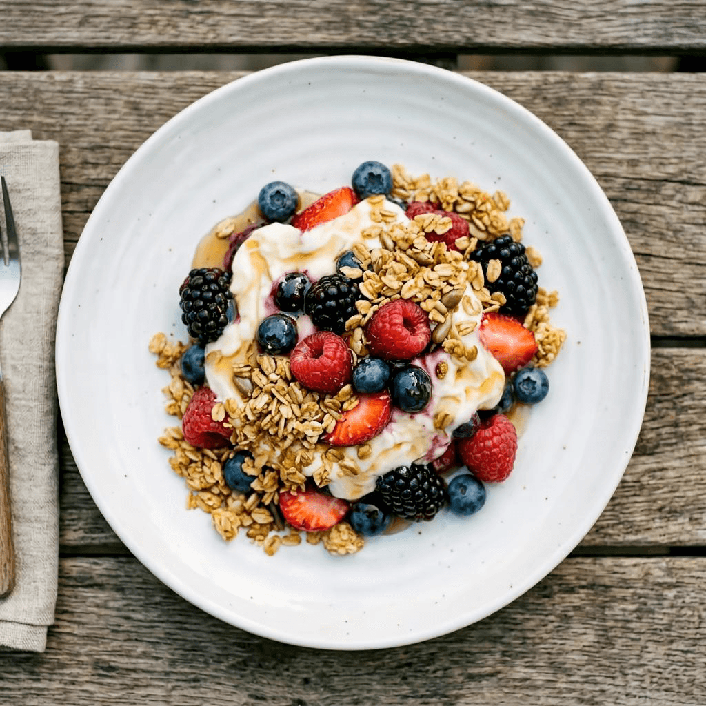 Blackberry & blueberry parfait with vanilla bean Greek yogurt and oat crumble - $14