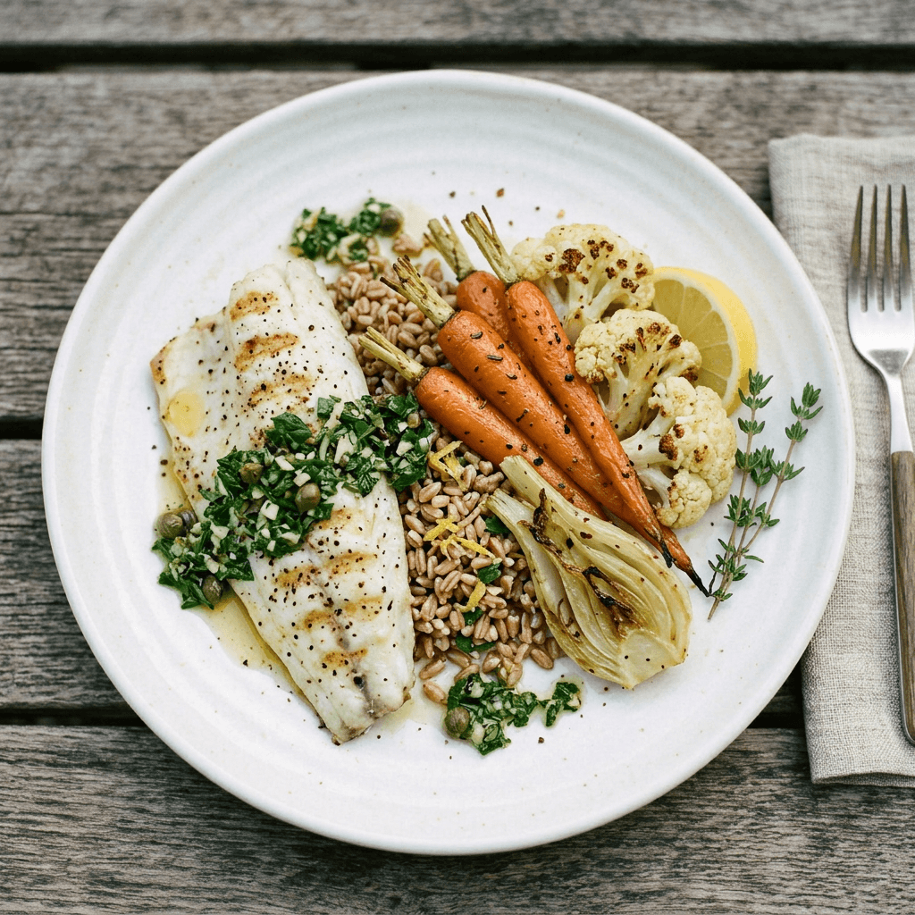 roasted carrots, cauliflower, fennel, farro, Italian salsa verde