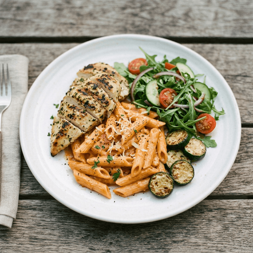 penne alla vodka, pan roasted zucchini, side salad
