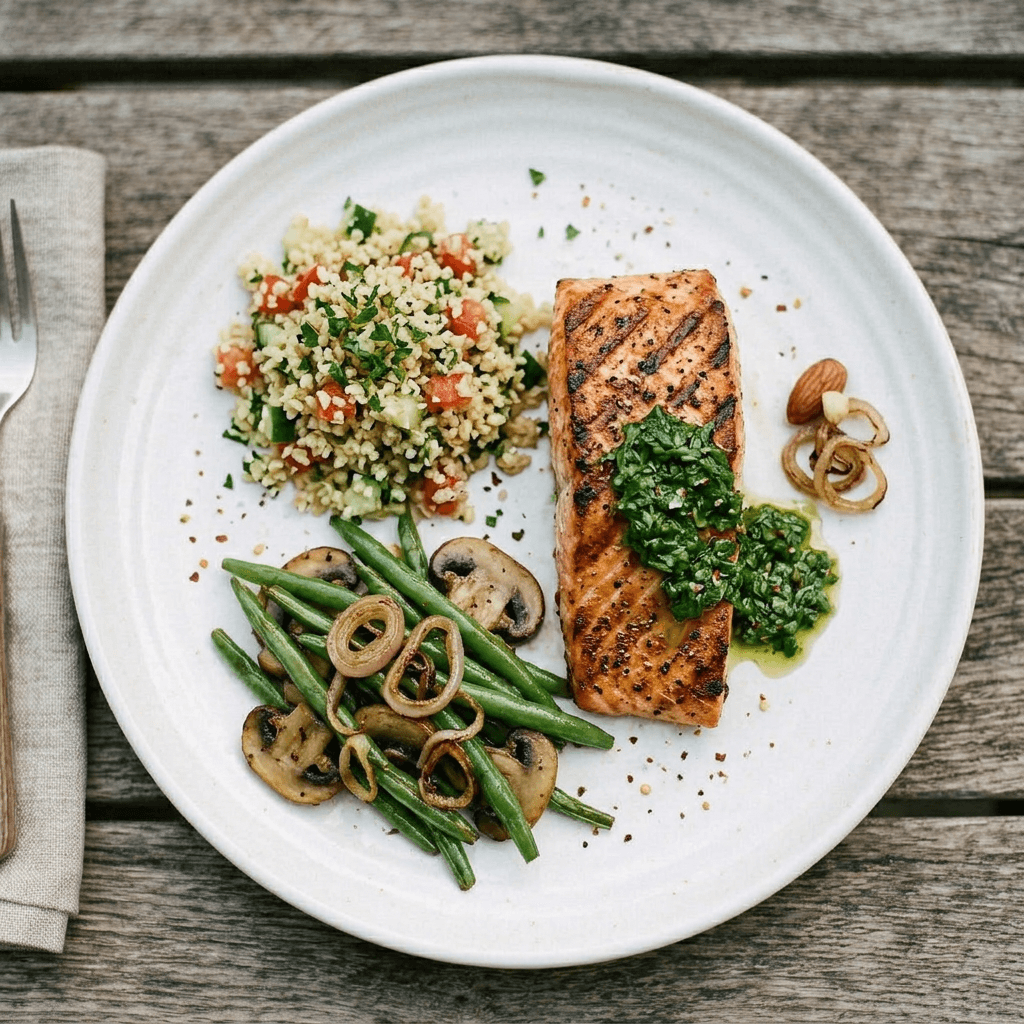 sauteed green beans, mushrooms, shallots, tabbouleh, chimichurri
