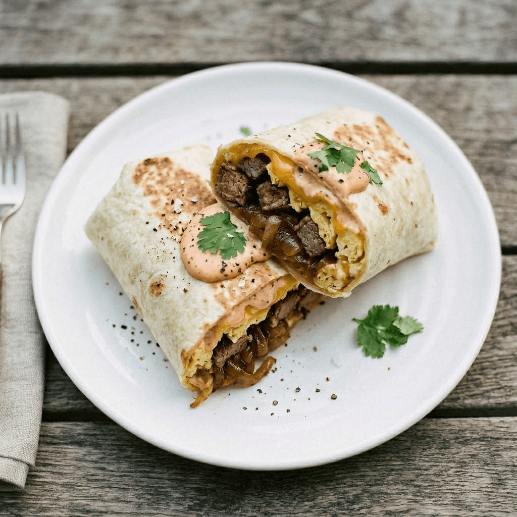 Steak & egg burrito with caramelized onions, cheddar & chipotle crema $14