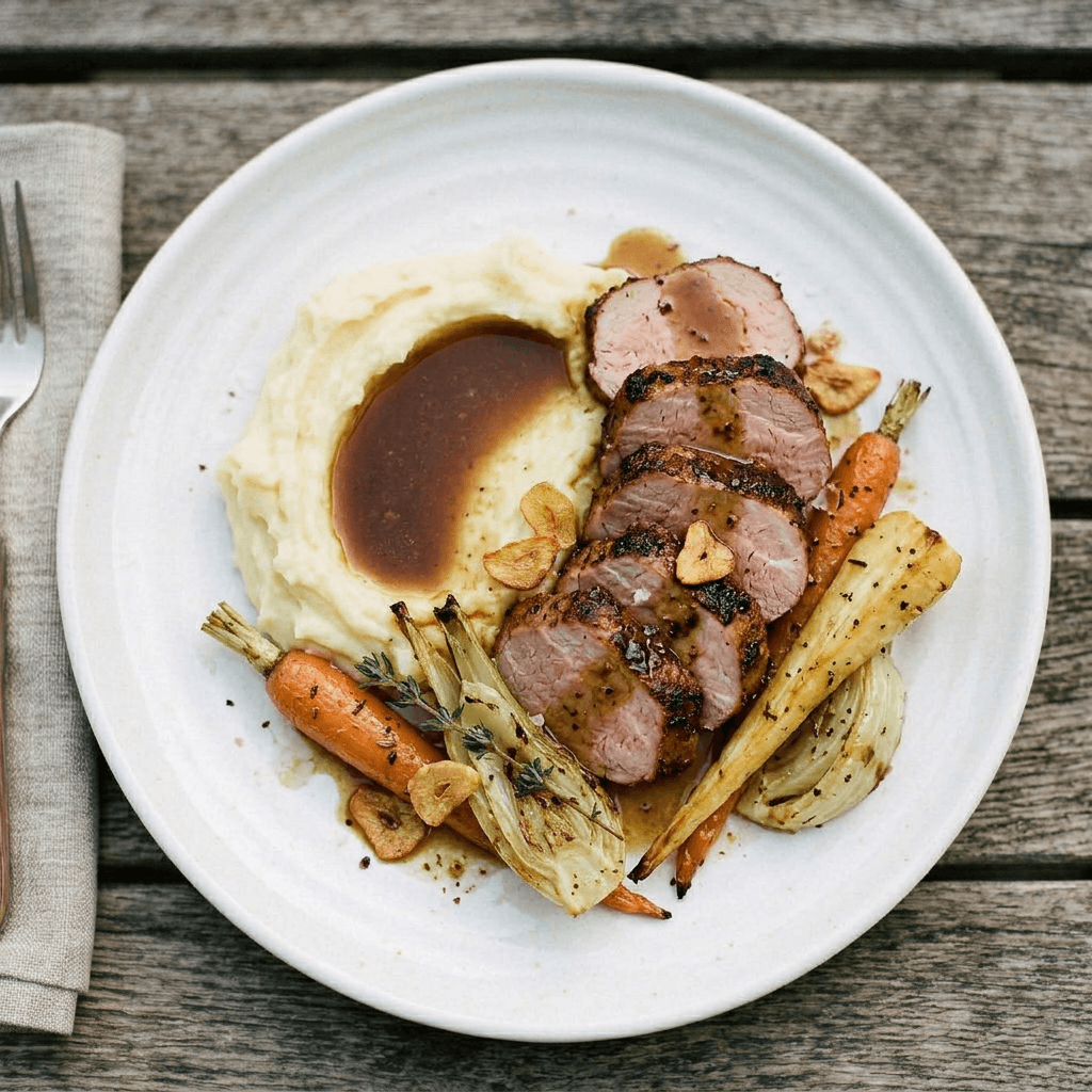mashed potatoes, roasted carrots, fennel and parsnips, pan jus