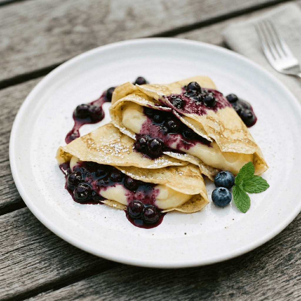 Crepes filled with pastry cream and blueberry compote