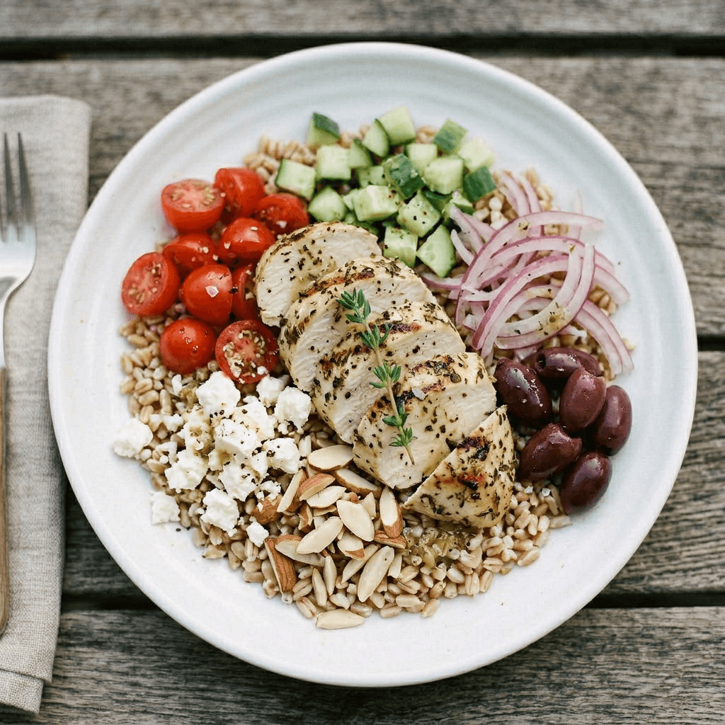 Mediterranean grain bowl with lemon herb grilled chicken, farro, feta, cherry tomato, cucumber, red onions, kalamata olives, and toasted almonds - $17