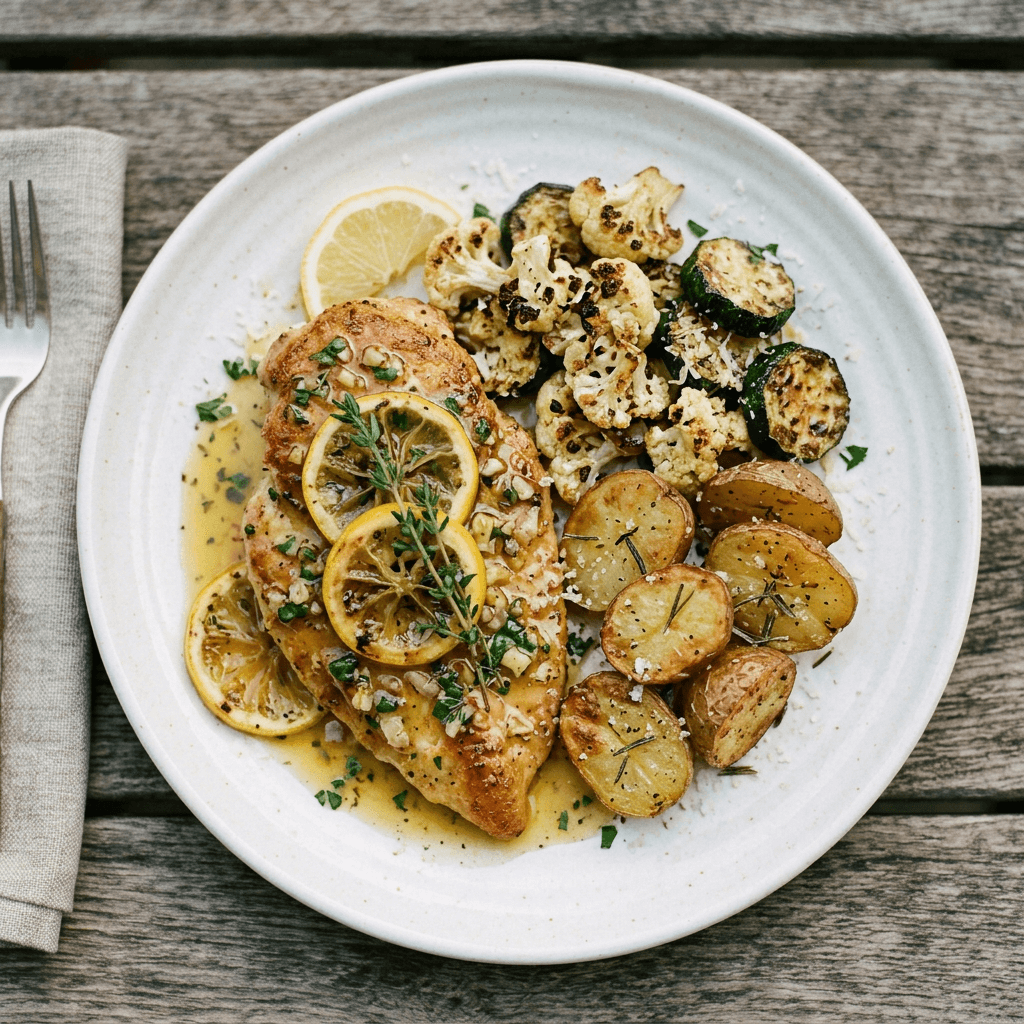 lemon herb pan sauce, roasted baby Yukons, roasted cauliflower and zucchini