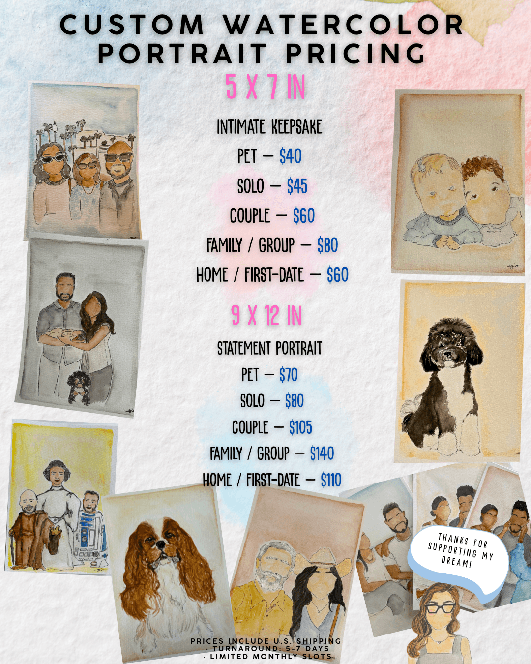 Each portrait is painted with love on high quality watercolor paper, shipped flat and securely in protective packaging.