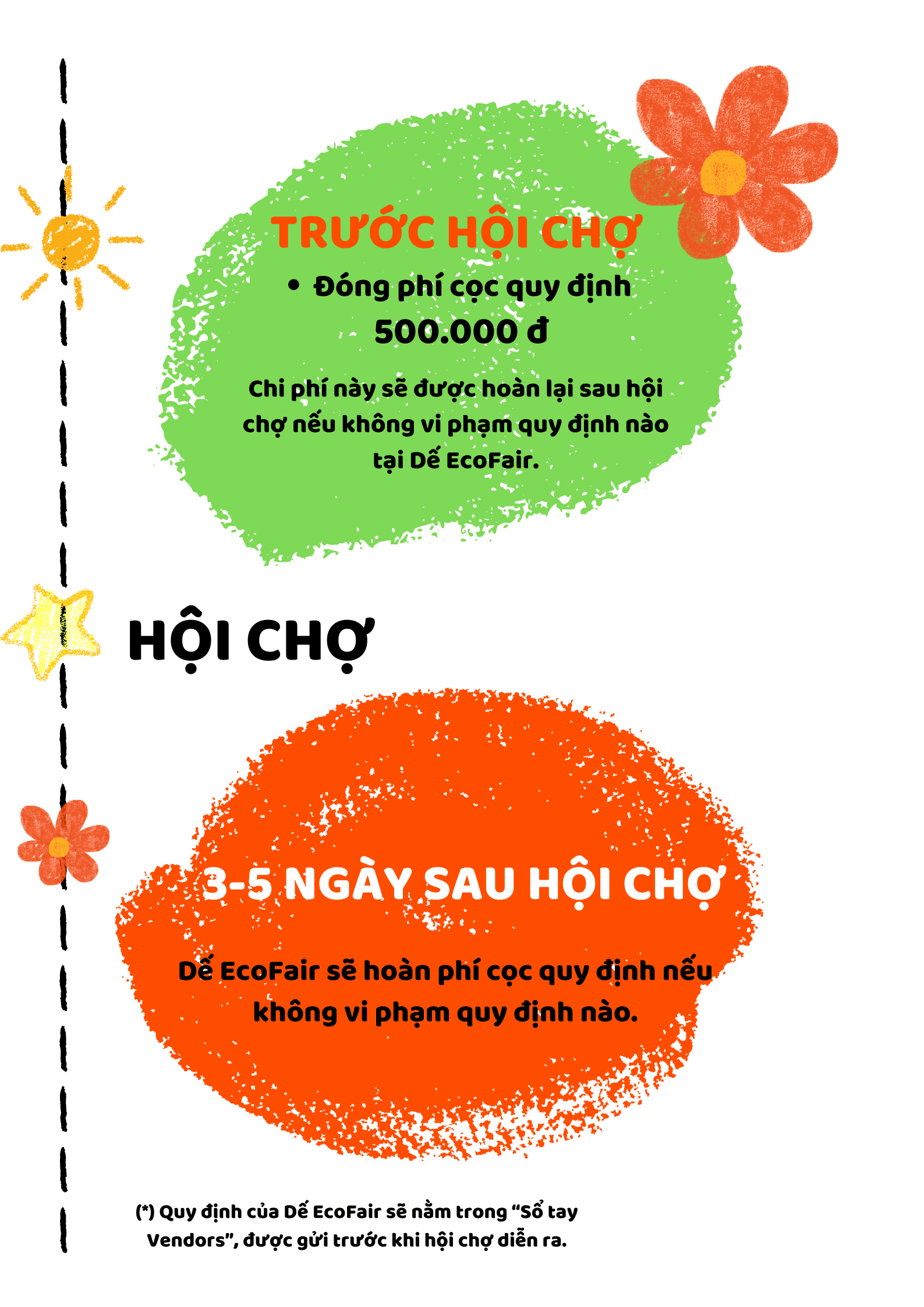 Trước khi sự kiện diễn ra, ngoài Phí tham gia gian hàng, BTC sẽ thu phí cọc bảo đảm 500.000 VND (Phí này sẽ hoàn lại sau khi vendors hoàn trả lại mặt bằng như ban đầu)
