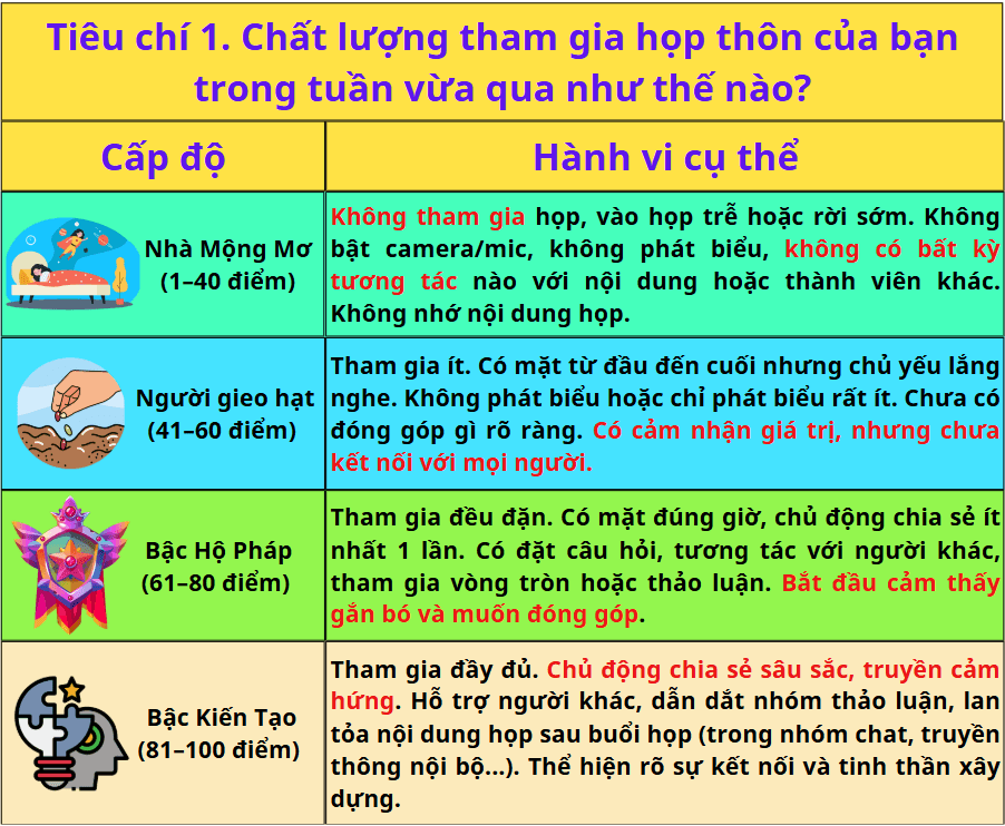 Tiêu chí 1. Chất lượng tham gia họp thôn của bạn trong tuần vừa qua như thế nào?