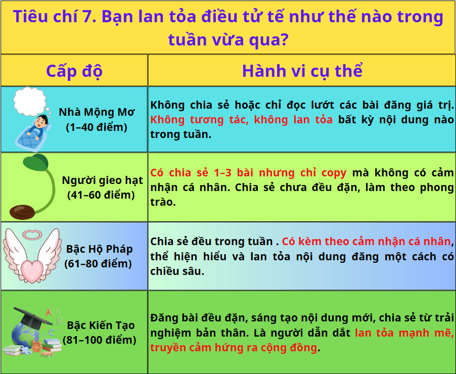 Tiêu chí 7. Bạn lan tỏa điều tử tế (Nội dung, hình ảnh, video) như thế nào trong tuần vừa qua?
