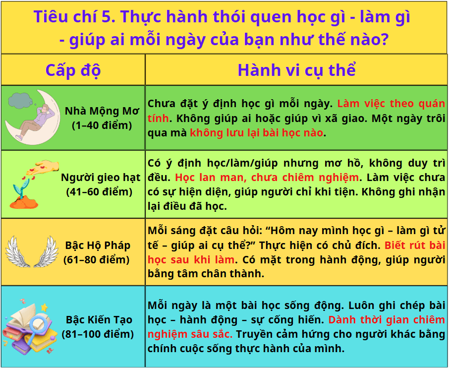 Tiêu chí 5. Thực hành thói quen học gì - làm gì - giúp ai mỗi ngày của bạn như thế nào?