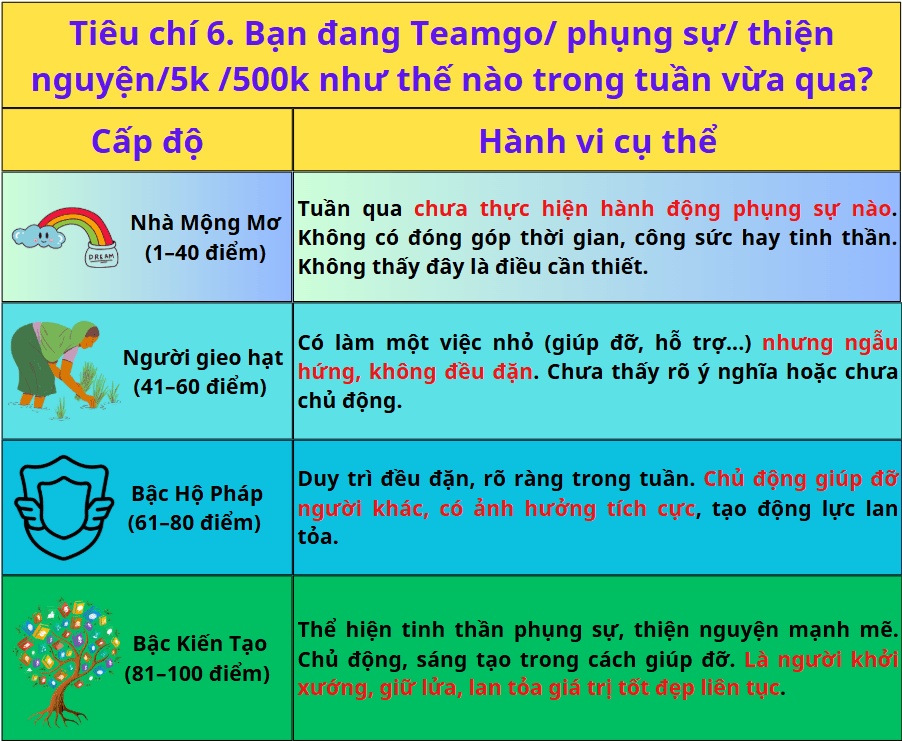 Tiêu chí 6. Bạn đang Teamgo/ phụng sự/ thiện nguyện/5k /500k như thế nào trong tuần vừa qua?
