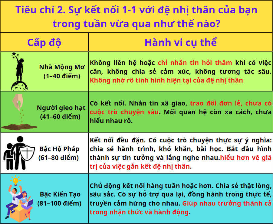Tiêu chí 2. Sự kết nối 1-1 với đệ nhị thân của bạn trong tuần vừa qua như thế nào?