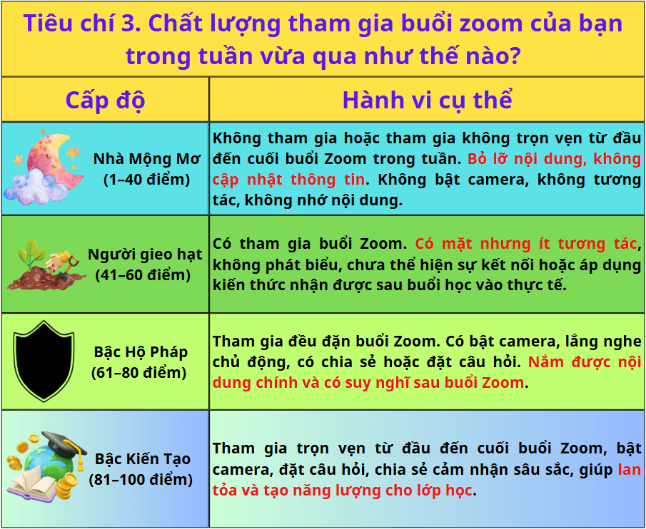 Tiêu chí 3. Chất lượng bạn tham gia buổi zoom học đạo lý cùng với Thầy Trần Việt Quân trong tuần vừa qua như thế nào?