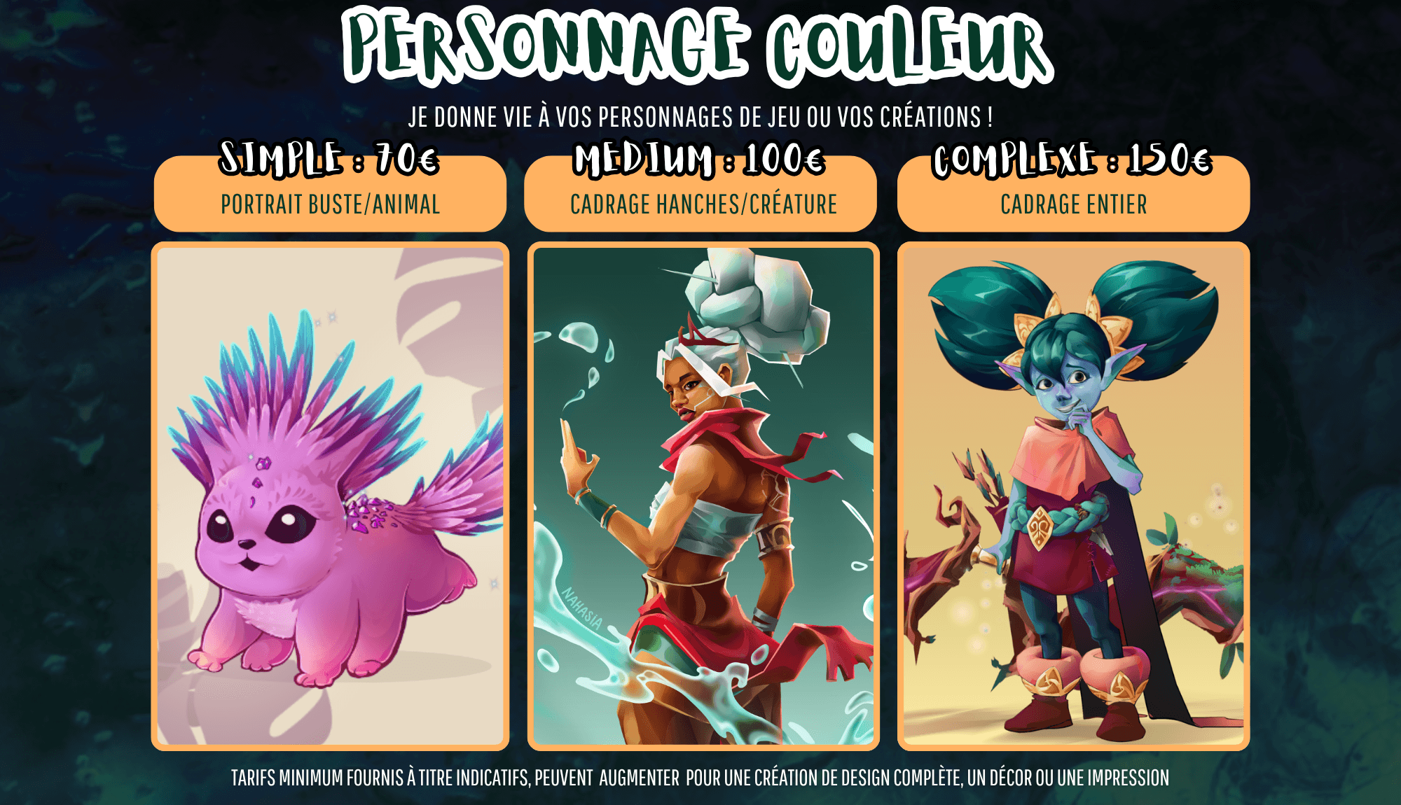 ATTENTION : La qualité du rendu final dépend de la qualité des références. (surtout pour les portraits d'animaux) Les photos floues ou trop sombres ne pourront pas être correctement illustrées - vous êtes prévenus.