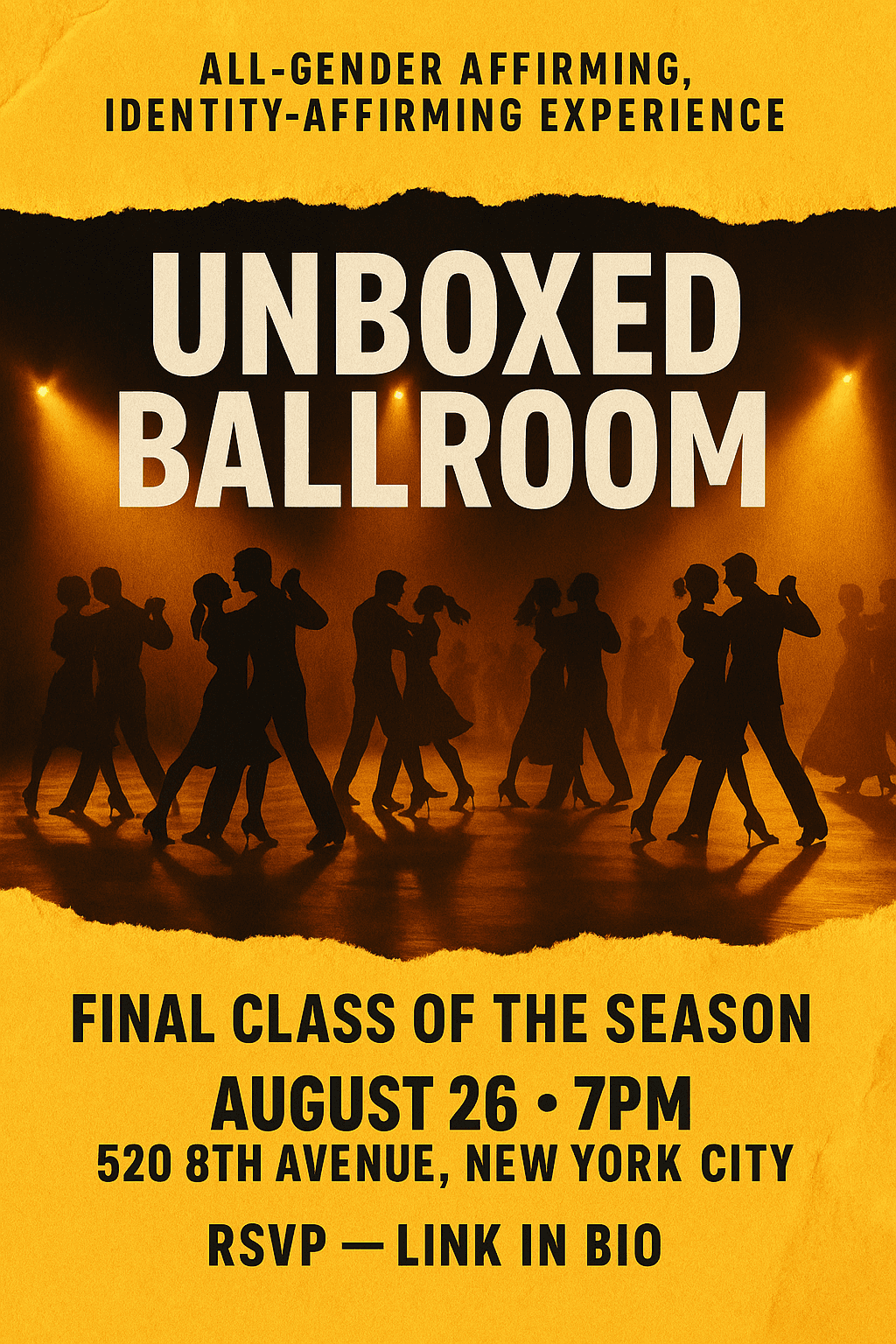 Unboxed Ballroom is a classical ballroom class experience that’s all-gender inclusive and identity-affirming, designed to center joy, connection, and community. It’s a space for belonging. A space to take up space — in your full rhythm, your truth, your expression.