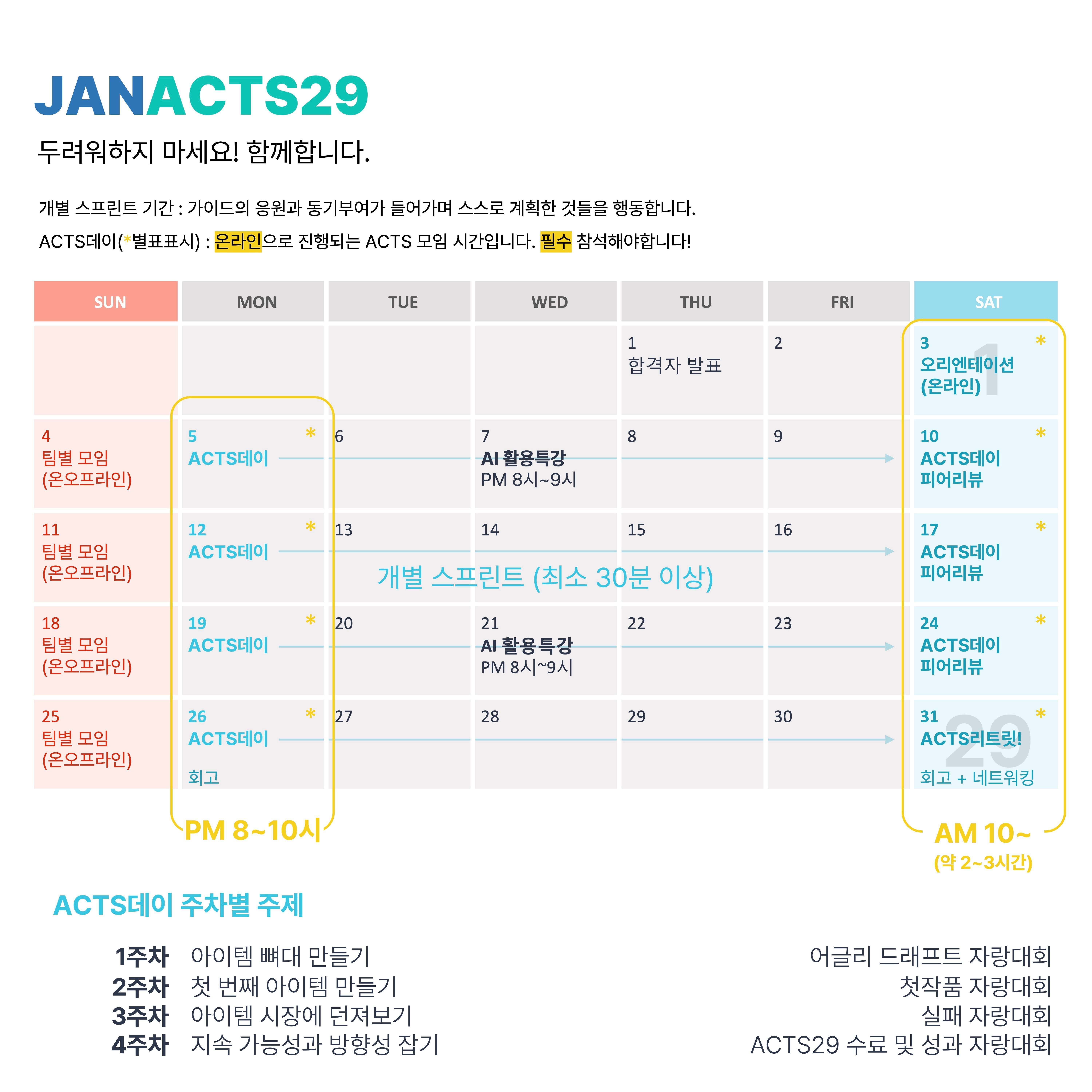 ACTS29는 29일(4주)이라는 시간 동안 당신의 고유한 아이디어를 손에 잡히는 '실체'로 만들고 전문가와 함께 시장에 던져보는 프로젝트를 진행합니다.