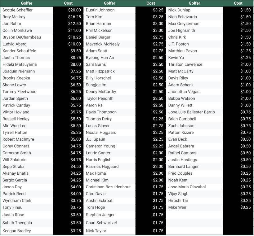 - Each golfer is assigned a price based on their odds to win the tournament and you'll select your team using a budget of $30. Please double check your math!